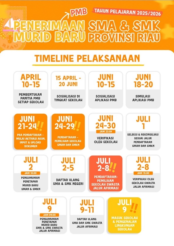 Bathin Solapan (30/04), Sistim Penerimaan Murid Baru (SPMB) untuk SMA di Provinsi Riau Tahun Pelajaran 2025/2026 dibuka mulai tanggal 21 Juni 2025. Bagi calon peserta didik yang ingin mendaftar SMA Riau 2025, diimbau untuk mempersiapkan diri dengan sebaik-baiknya. Pastikan Anda melengkapi semua persyaratan yang dibutuhkan. Sistem Penerimaan Murid Baru (SPMB) pada tahun 2025 jenjang Sekolah Menengah Atas se-Provinsi Riau Tahun Pelajaran 2025/2026 dilakukan secara dalam jejaring (Daring/Online) melalui alamat https://pmb.riau.go.id/ Aplikasi dikembangkan bersama Dinas Komunikasi, Informatika dan Statistik (Diskominfotik) Provinsi Riau dan Dinas Pendidikan Provinsi Riau Dengan menggunakan layan Pusat Data Nasional (PDN) Kementerian Komunikasi dan Informatika Republik Indonesia.