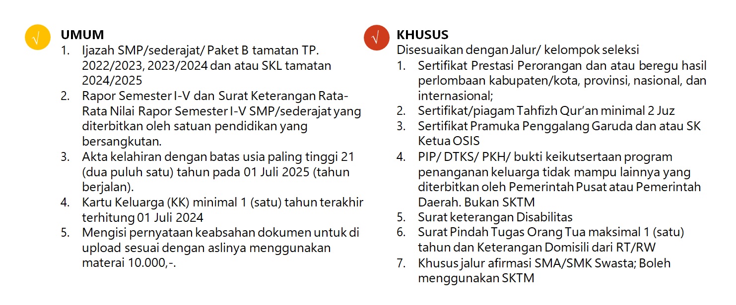 - Ijazah SMP/sederajat/ Paket B tamatan TP. 2022/2023, 2023/2024 dan atau SKL tamatan 2024/2025