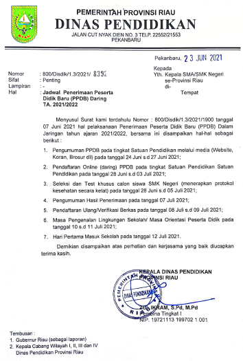 Berdasarkan Keputusan Kepala Dinas Pendidikan Provinsi Riau Nomor: Kpts.1173/2022. Tentang Petunjuk Teknis Penerimaan Peserta Didik Baru (PPDB) pada Jenjang Sekolah Menengah Atas Negeri
